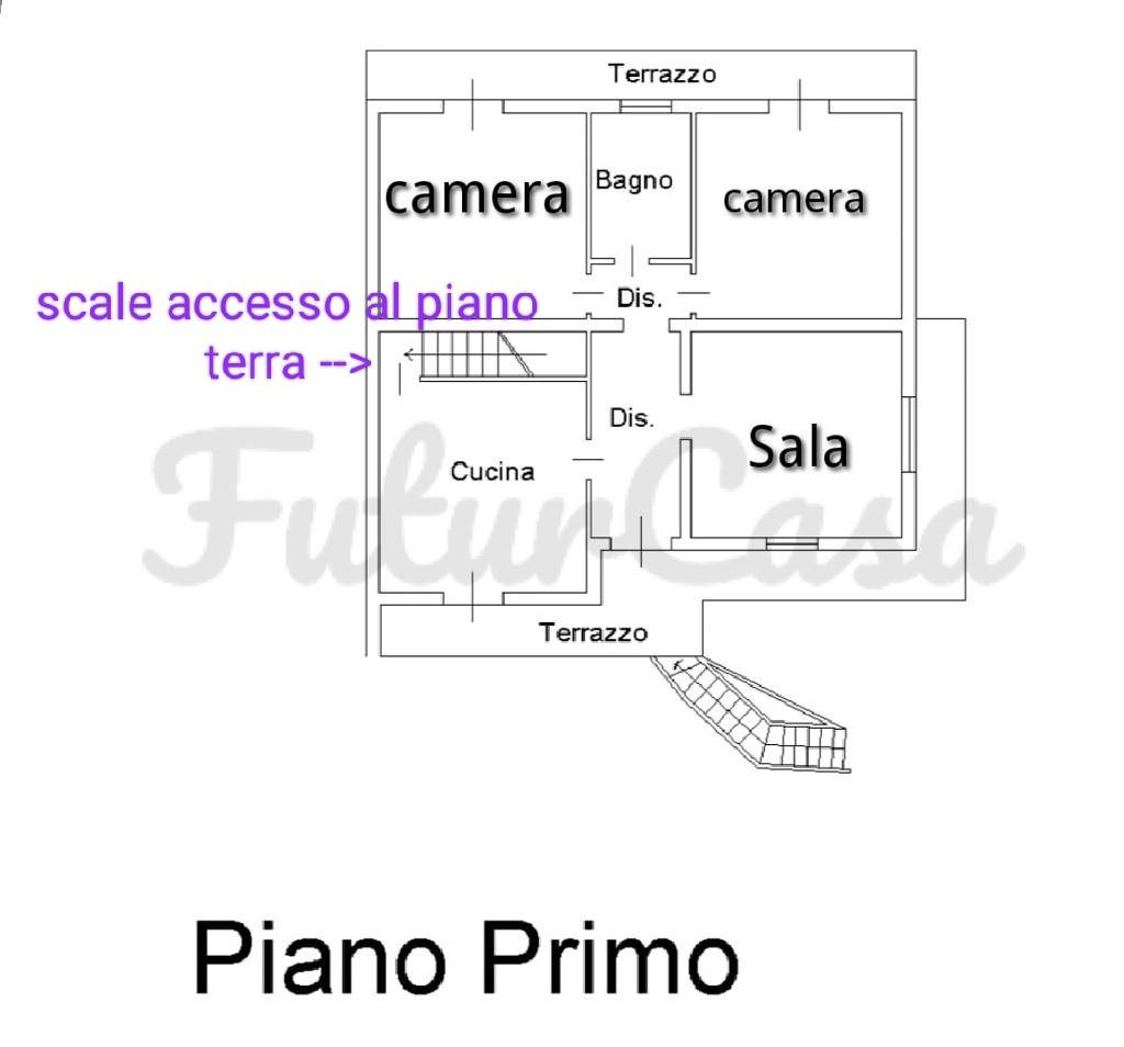 COMPOSIZIONE: La casa è disposta su due piani e libera su tre lati. Al piano primo troviamo l' abitazione principale, composta da ingresso ampio e luminoso, sala a vista con CAMINO, cucina abitabile con affaccio su terrazzo che si estende lungo tutta la parte frontale, disimpegno notte, due grandi camere matrimoniali entrambe con affacio su terrazza, scala d' accesso al piano terra, (NB: da notare piano terra e non seminterrato , il tutto finestrato, illuminato e pavimentato come il resto della casa) composto da due grandi stanze ed un bagno. Il piano terra ha anche un suo ingresso indipendente.